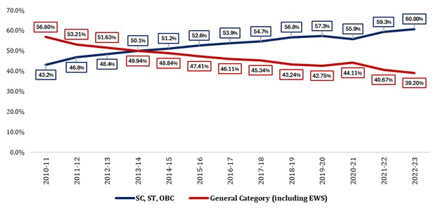 The General Category not only shows a year-on-year decline in absolute enrolment but also faces significant competition from SC/ST/OBC students who are competently acquiring general seats on merit.